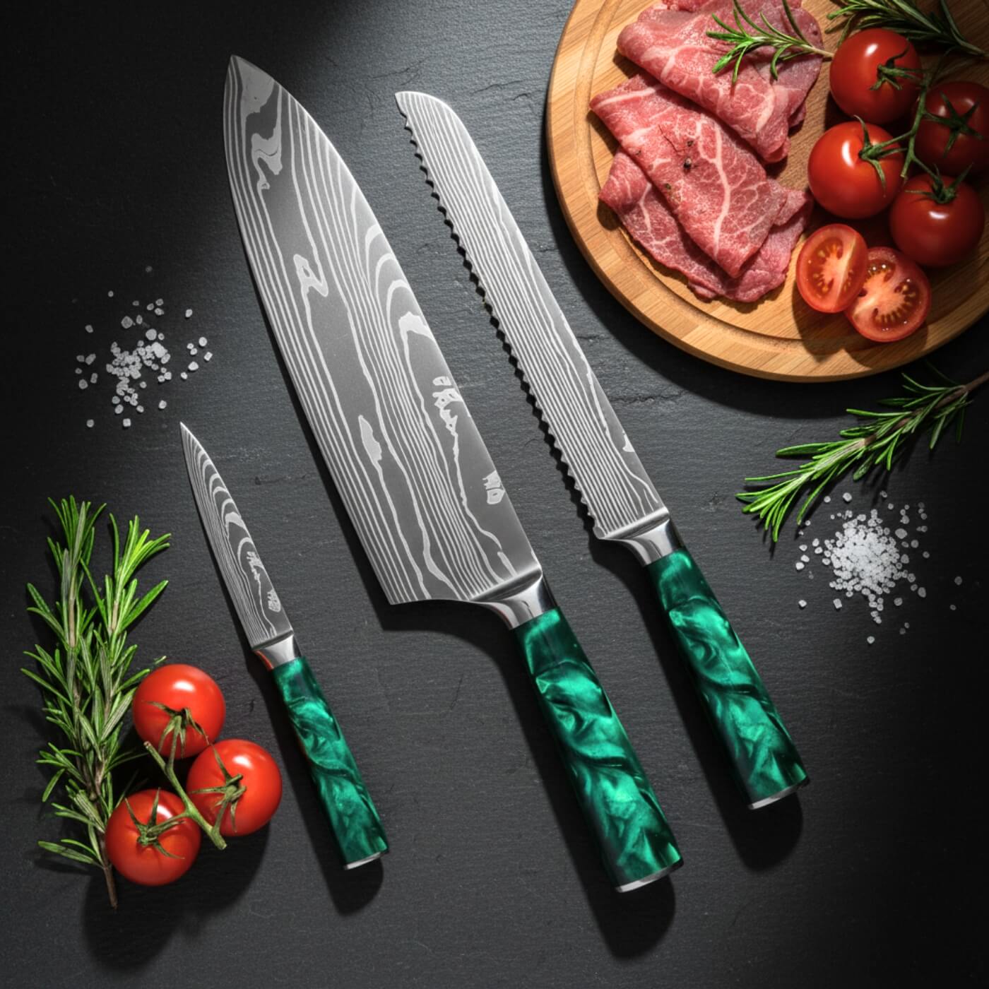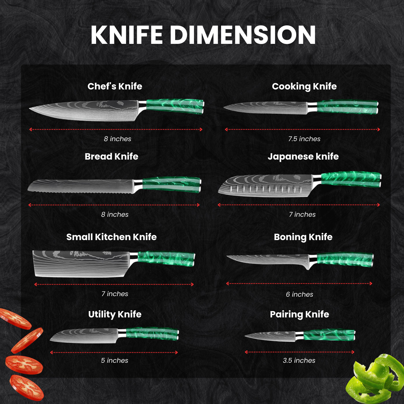 • Set Contents: 8 professional knives, including Chef's (8"), Cooking (7.5"), Bread (8"), Japanese Utility (7"), Small Kitchen, Boning, Utility, and Paring (3.5").