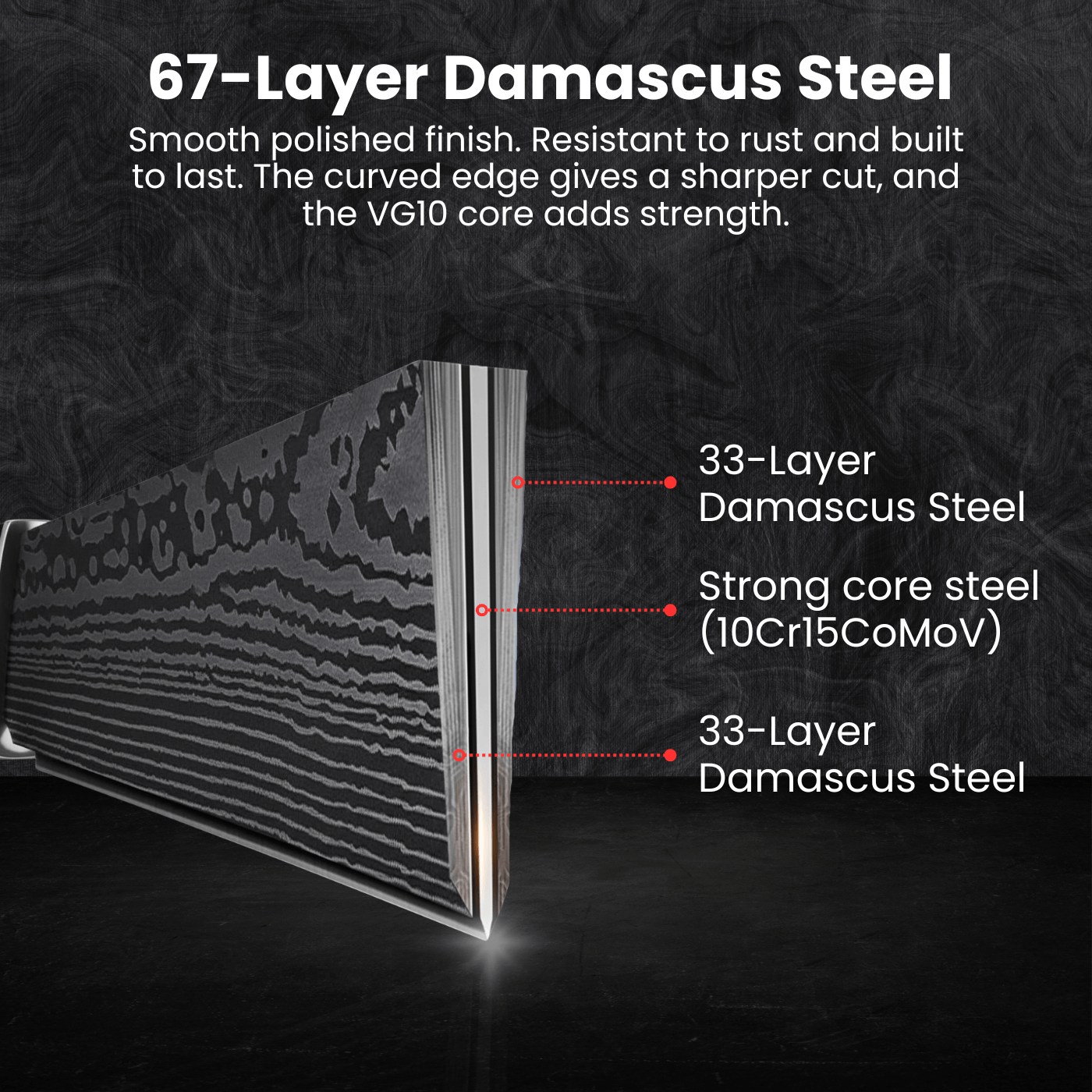 • Blade Material: Premium Hand-finished Damascus Steel (67-Layer VG10 Core or 33-Layer 10Cr15CoMoV Core).