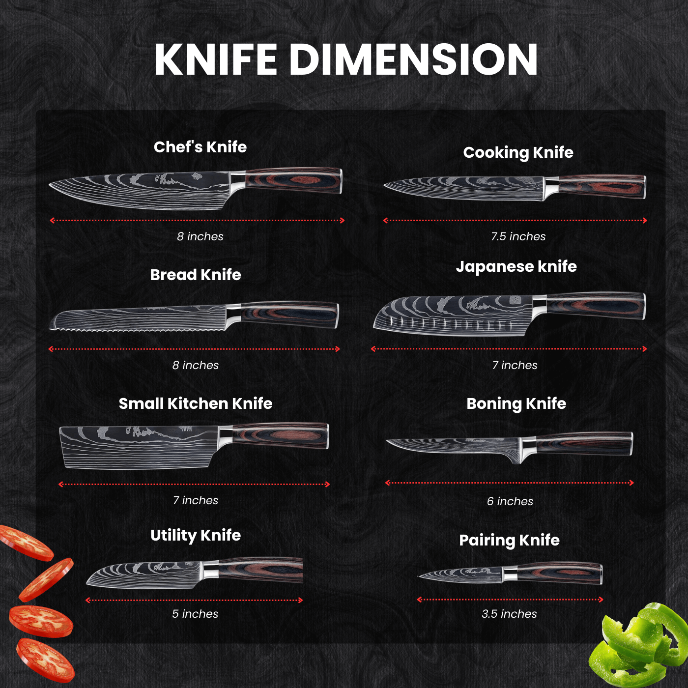 • Set Contents: 8 professional knives, including Chef's (8"), Cooking (7.5"), Bread (8"), Japanese Utility (7"), Small Kitchen, Boning, Utility, and Paring (3.5").